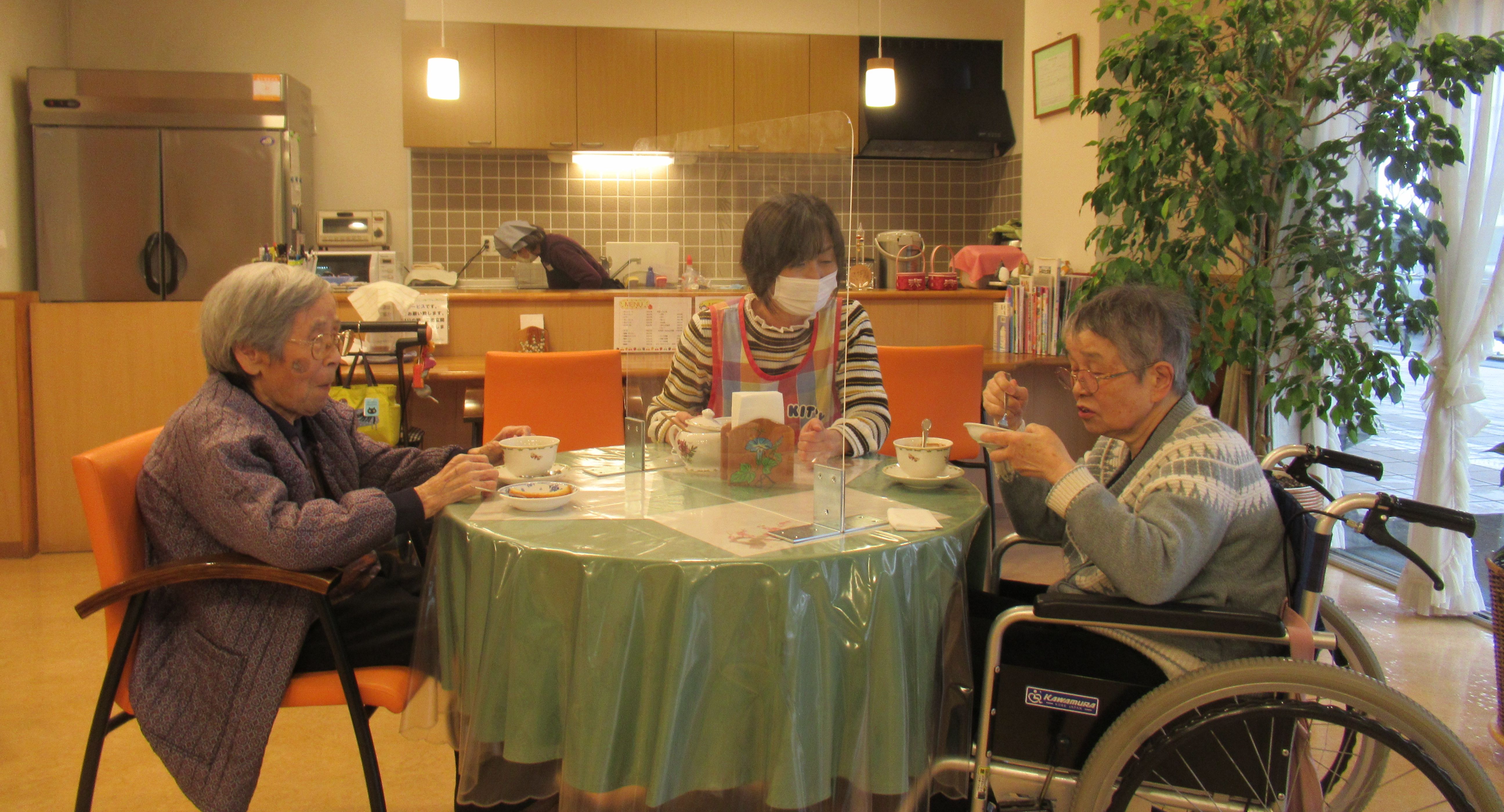 1階の喫茶コーナーは、ご入居者様とご家族様が、ユニットを離れて、ゆっくり面会され歓談していただける場としてご利用いただいています。また、ご入居者様と職員がゆとりの時間にお茶をしたり、デイサービスご利用者様がお友達とご利用されたり、地域の方々が散歩の途中に立ち寄られたり、職員が喫食したり等「気分をリフレッシュする癒しのスペース」として利用されています。