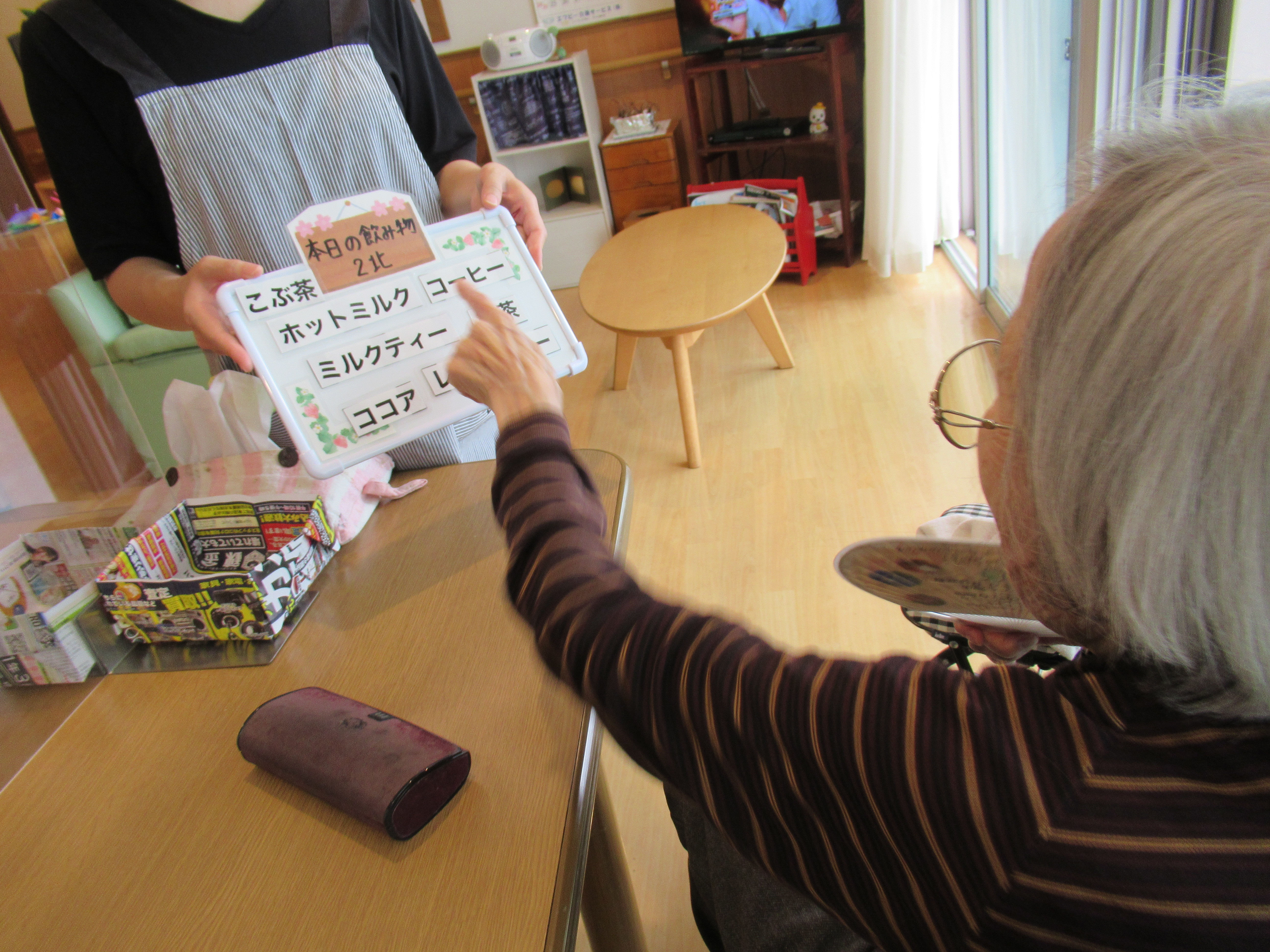 おやつは、お好きなものを選んでいただきます。スタッフ手作りのおやつの時もあります。